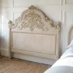 Use a soft lavender or grey-blue for the main duvet. I like to leave some white space in the center of the bed to make the fabric look reflective and airy.