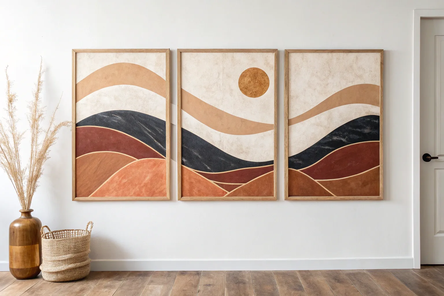 Unified-palette mixed media triptych: clean Scandinavian calm with bold boho texture