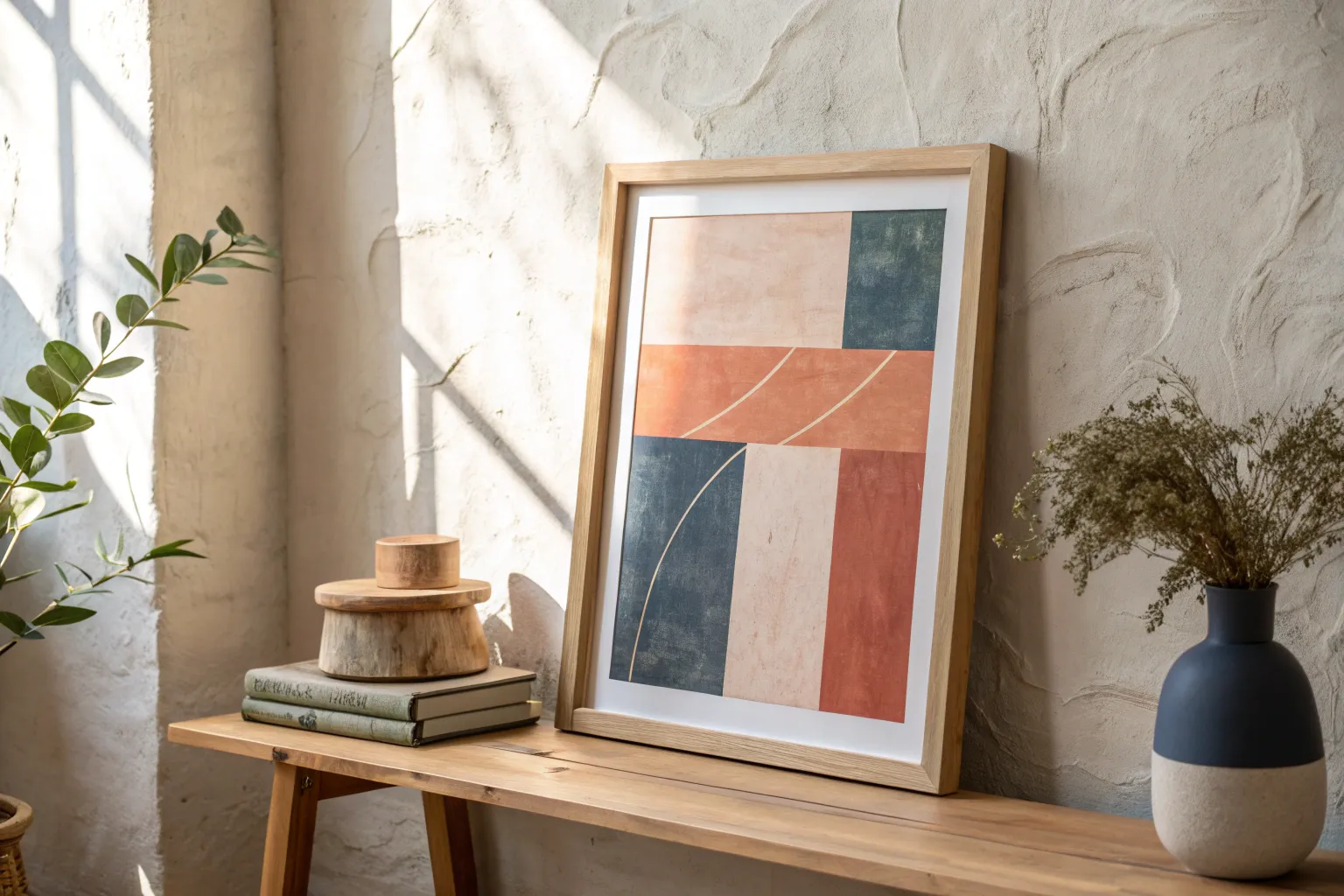 This charming project takes advantage of neglected wall space by adding a pop of color right next to a door frame. Using simple geometric forms and an earthy color palette, you’ll create a petite abstract piece that brings subtle warmth to a functional area.