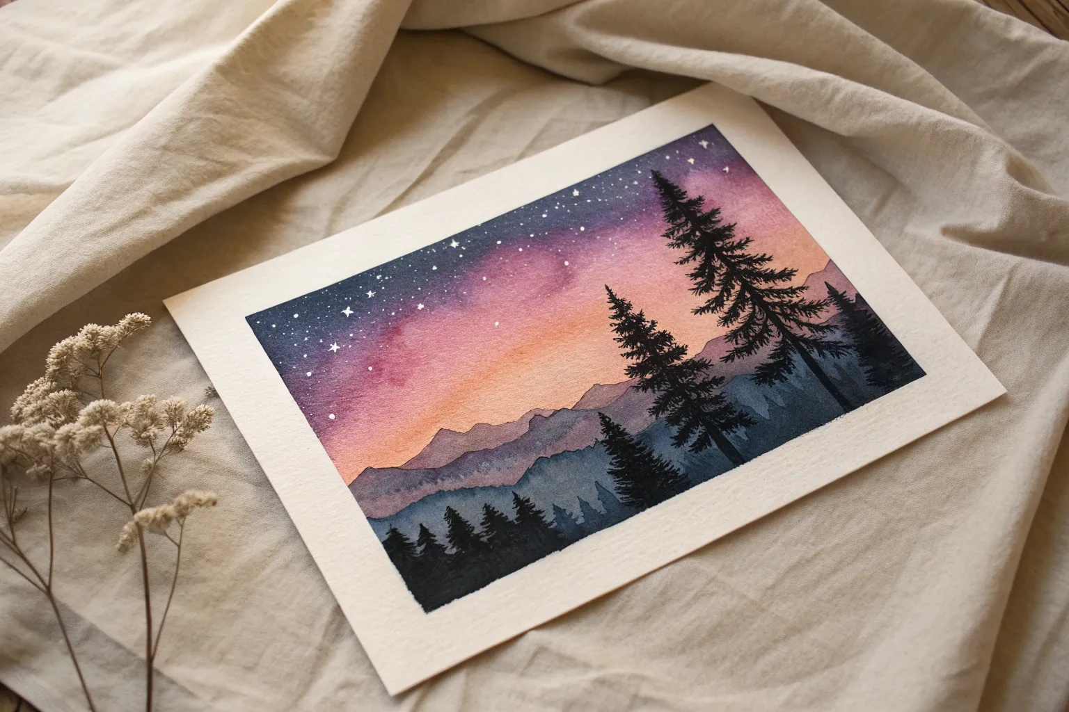 Capture the serene beauty of a crisp night sky with this moody watercolor piece. Using a simple wet-on-wet gradient technique, you’ll create a glowing galaxy background that perfectly frames sharp, dark pine tree silhouettes.