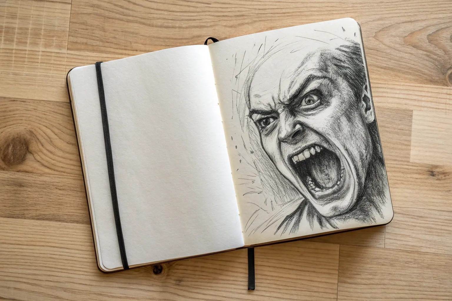 Capturing raw emotion, this striking sketchbook spread juxtaposes a detailed, expressive facial study with the abstract geometry of broken glass. Using tan-toned paper adds instant depth and allows for dramatic highlights, making the anger and anguish feel immediate and visceral.