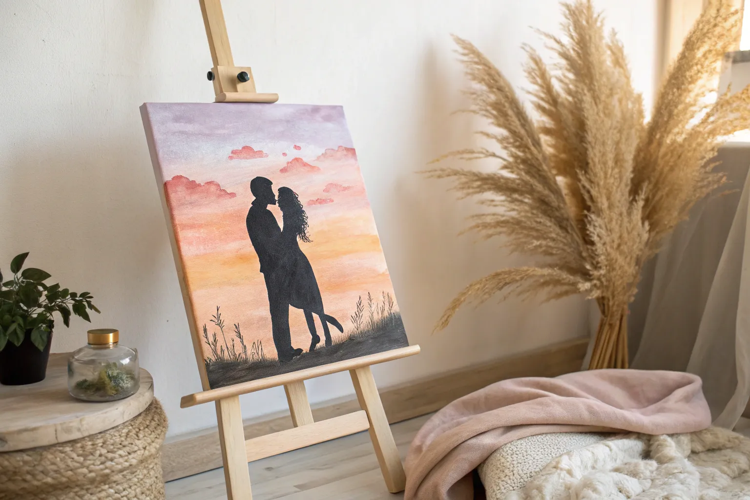 Minimal couple silhouette at sunset on canvas, a romantic anniversary idea with space to personalize