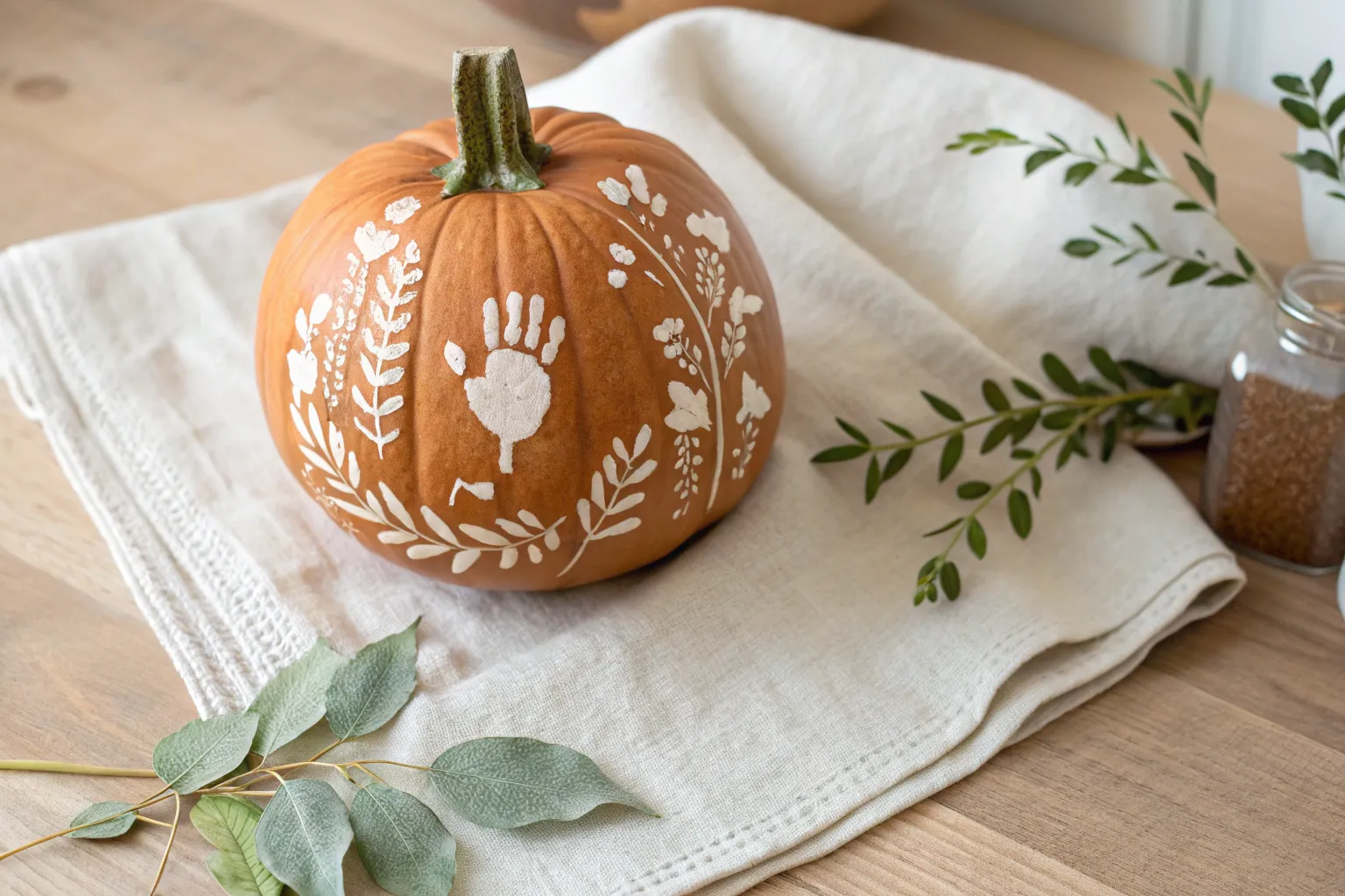 Capture the fleeting magic of your baby’s tiny size with this elegant and minimalist keepsake pumpkin. Featuring a clean white base and a classic orange handprint, this project transforms a simple seasonal gourd into a treasured nursery decoration.