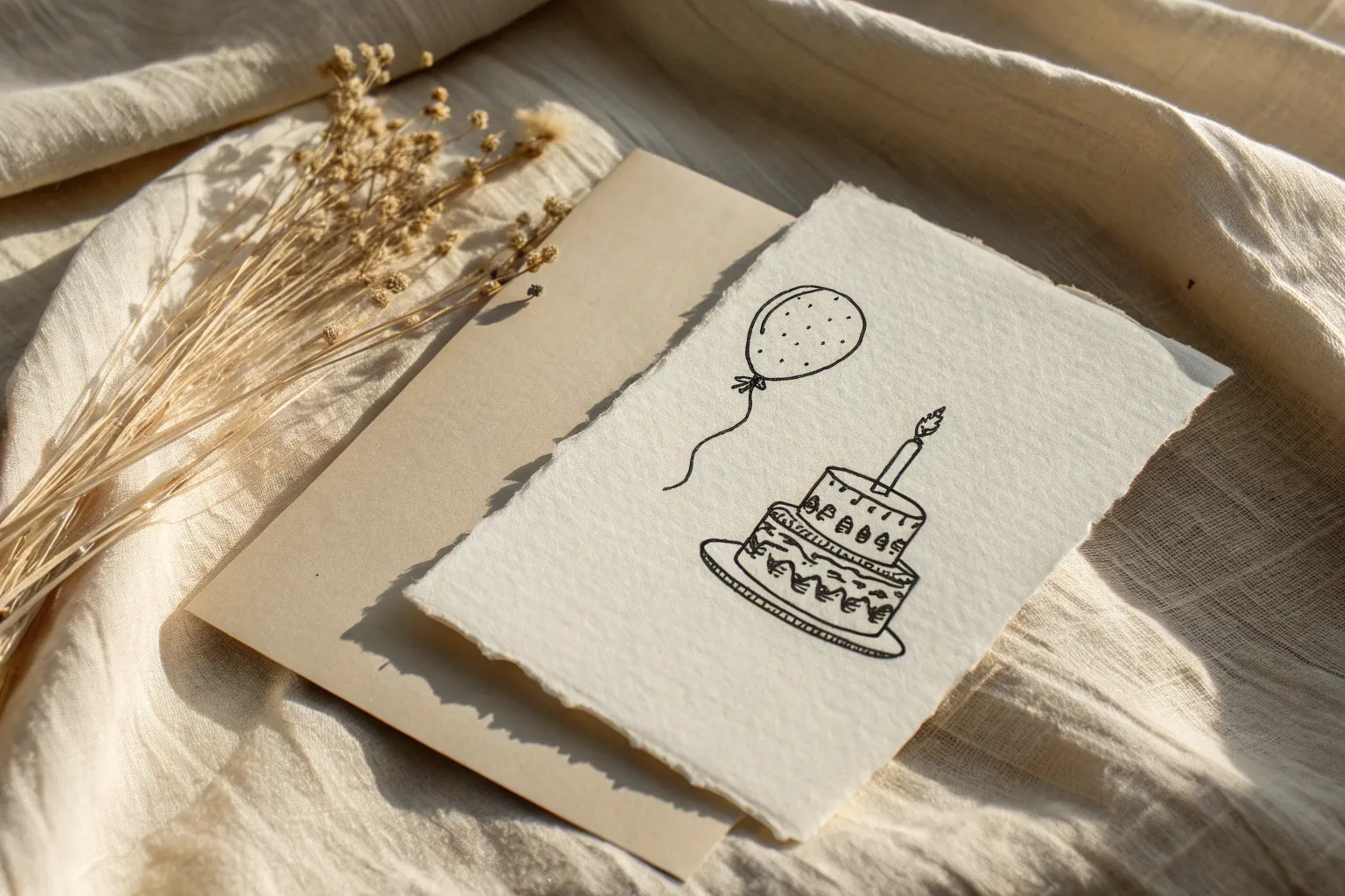 This elegant drawing combines crisp black linework with shimmering gold accents on textured handmade paper. It captures the joyful moment of a toast, making it perfect for custom birthday cards or invitations.