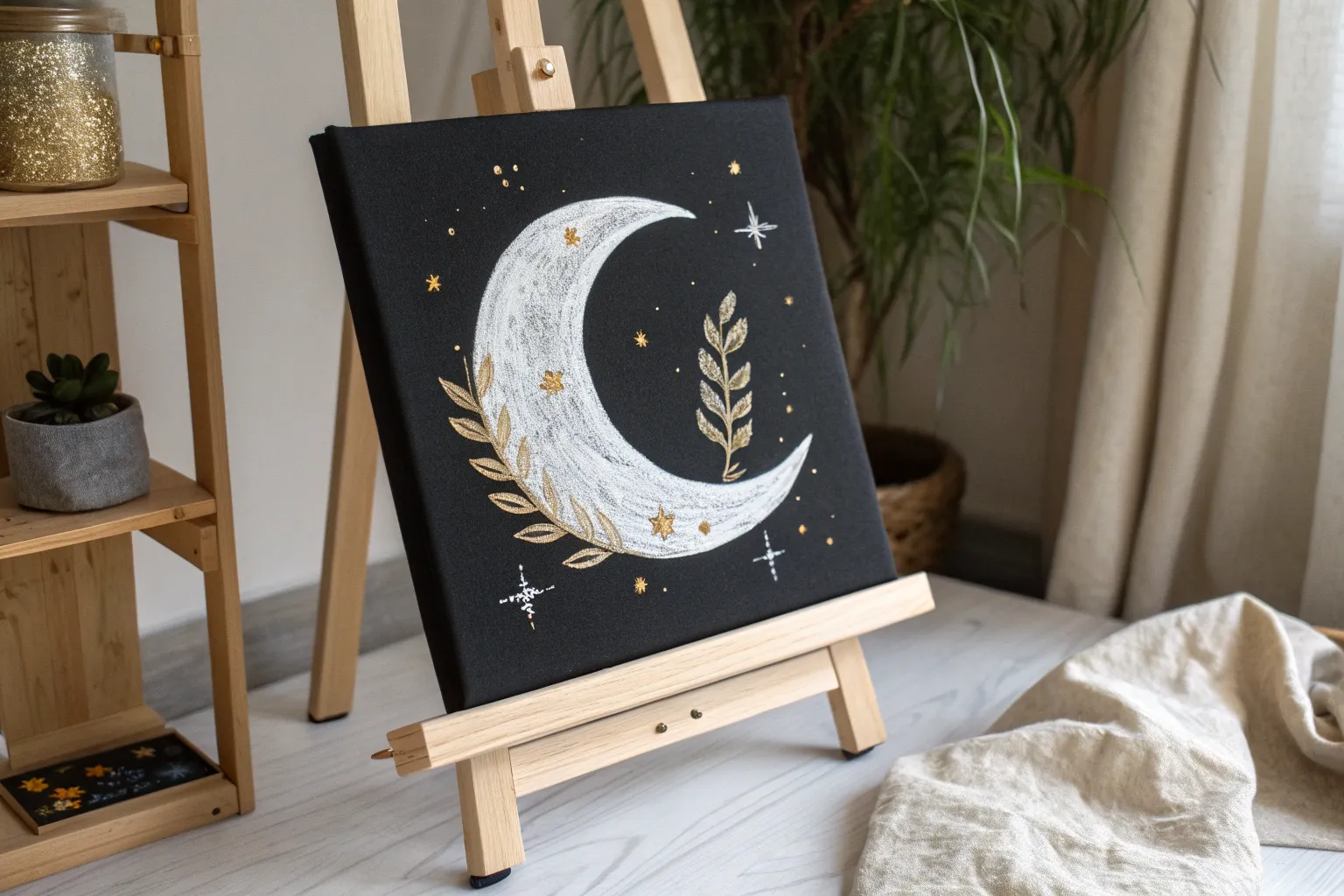 Mix iridescent medium or metallic gold paint into your planet’s highlight color. It adds a magical sheen that changes as you walk past the canvas.