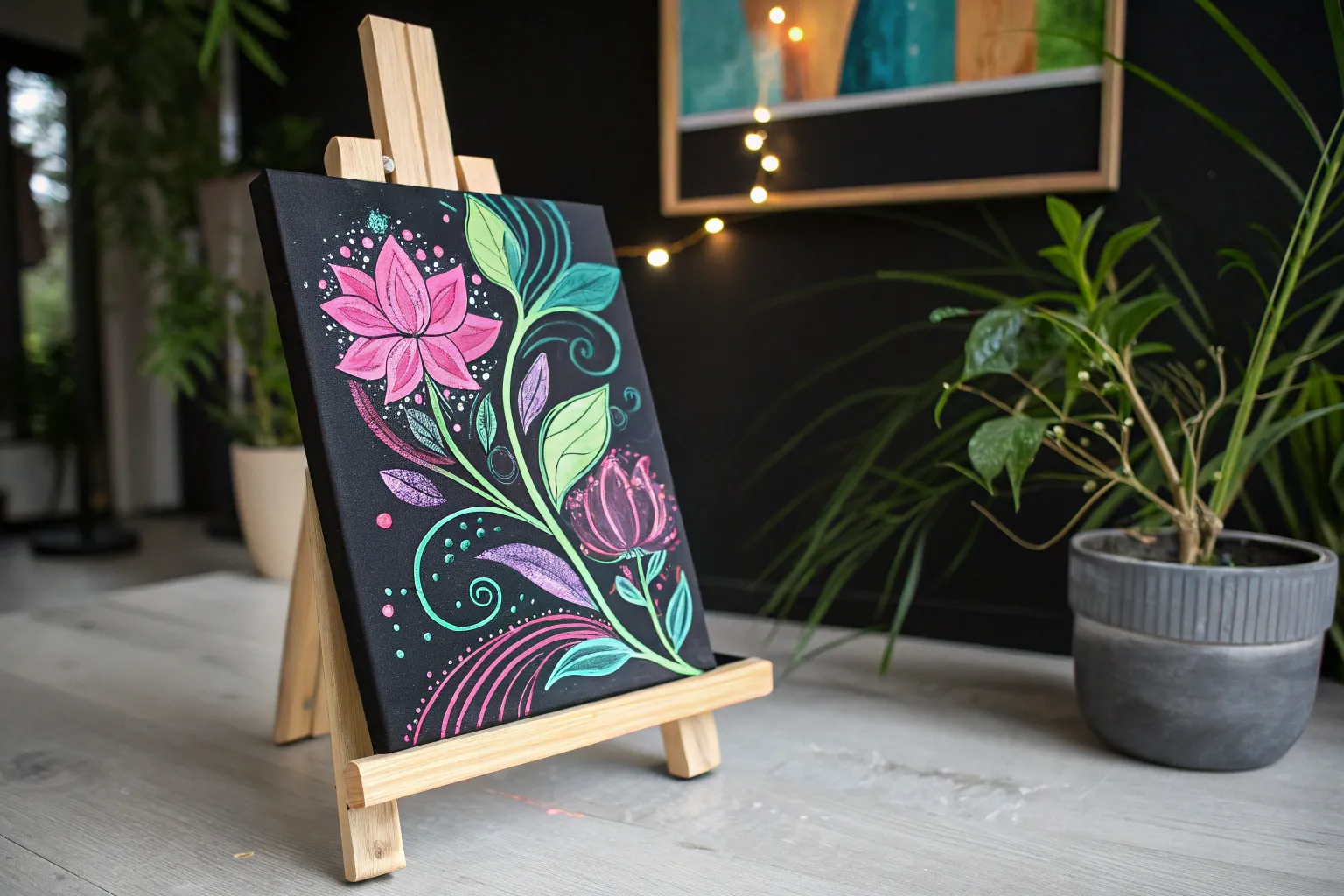 Transform a blank wall into a vibrant, interactive canvas using oversized blackboards and high-pigment neon chalks. This large-scale project creates a stunning, doodle-style mural with glowing botanical motifs that pop against the dark background, perfect for collaborative art spaces.