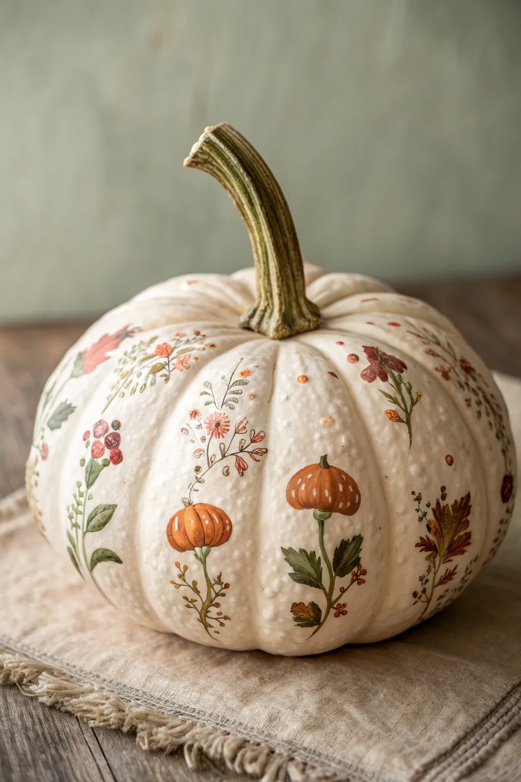 Transform a textured white pumpkin into a storybook garden scene by painting delicate mushrooms and wildflowers directly onto its surface. This project replicates the charm of vintage botanical illustrations, using the pumpkin’s natural bumps to enhance the 3D effect of the painted fungi.