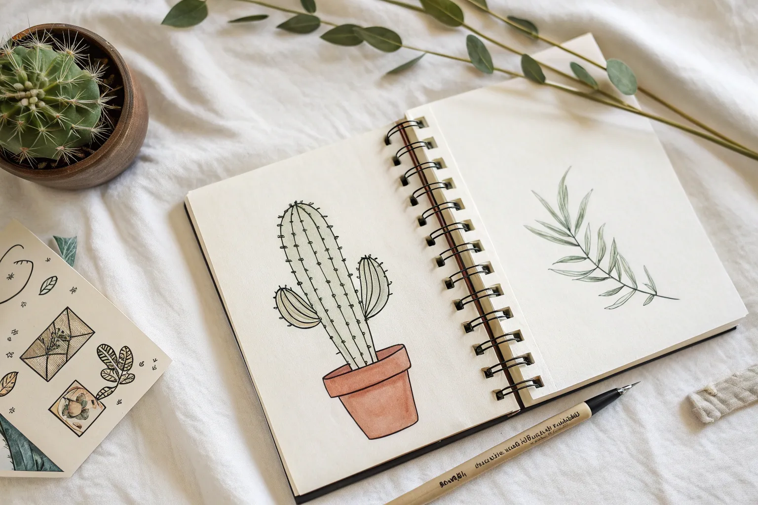 This charming ink drawing captures the organic, segmented growth of a prickly pear cactus with crisp lines and delicate details. Using simple fineliners on warm-toned paper, you’ll build a towering stack of paddle shapes filled with character and texture.