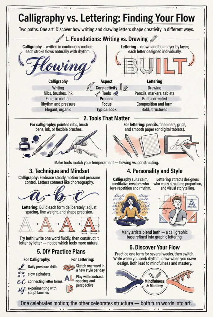 Both calligraphy and lettering turn written words into visual art—but they do so in very different ways. Understanding these differences can help you find which approach best fits your creative rhythm and artistic goals.
