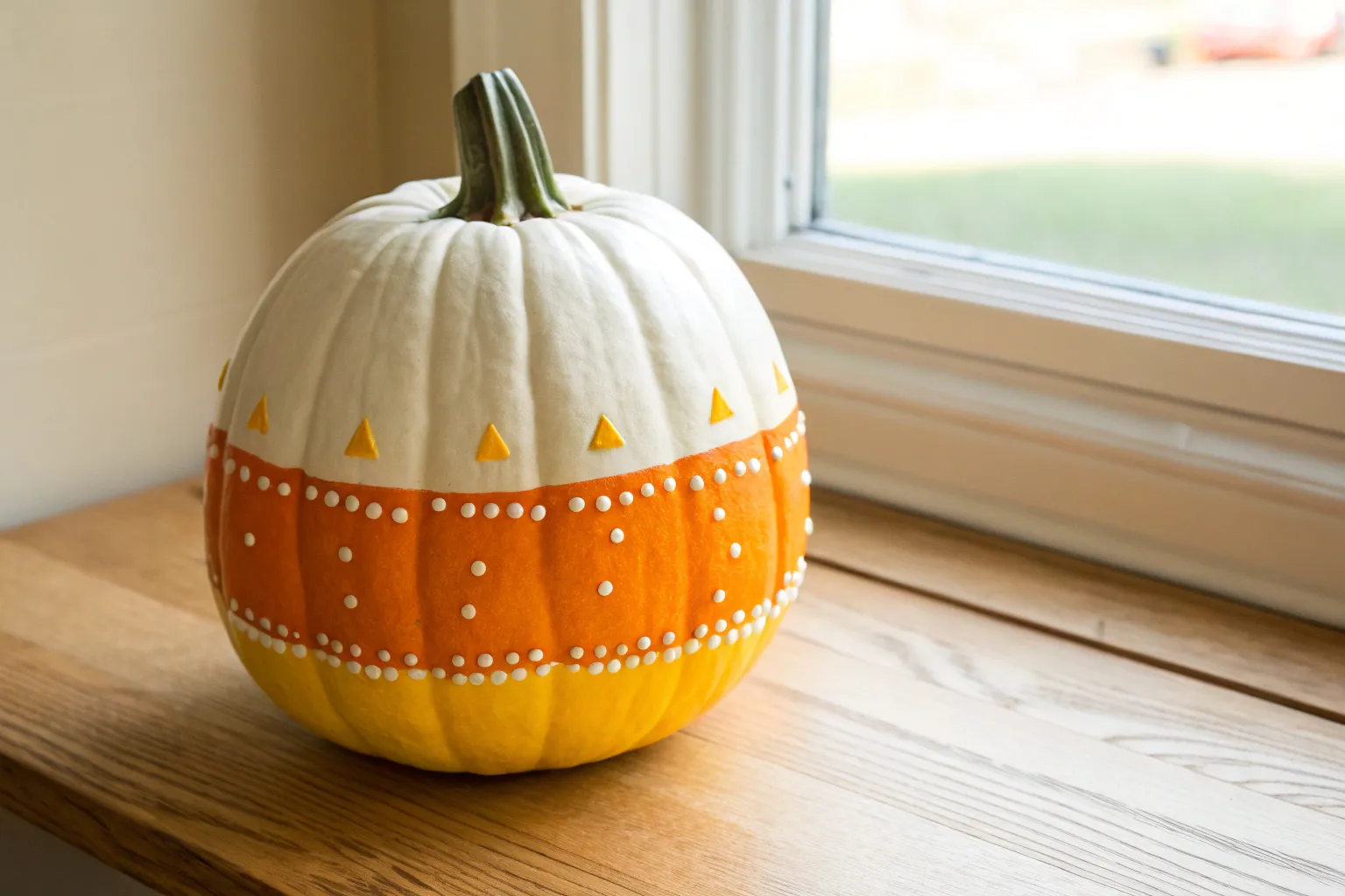 Give your Halloween decor a softer, sweeter touch with this candy corn-inspired pumpkin design. Instead of stark, aggressive lines, this project uses blended, painterly stripes in classic white, orange, and yellow hues to create a charming handcrafted look.