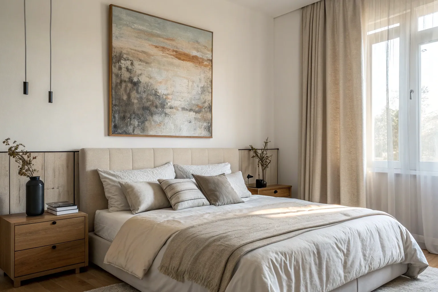 A calm, modern triptych above the headboard that makes the whole bedroom feel finished