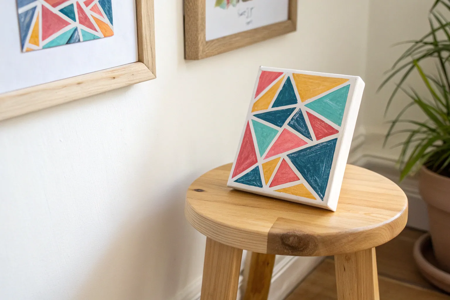 Transform a plain white canvas into a sophisticated geometric masterpiece using a simple tape-resist technique perfect for little hands. With a muted, earthy palette of dusty pinks, sage greens, and warm mustards, this project creates striking modern art that looks professional but is toddler-friendly.