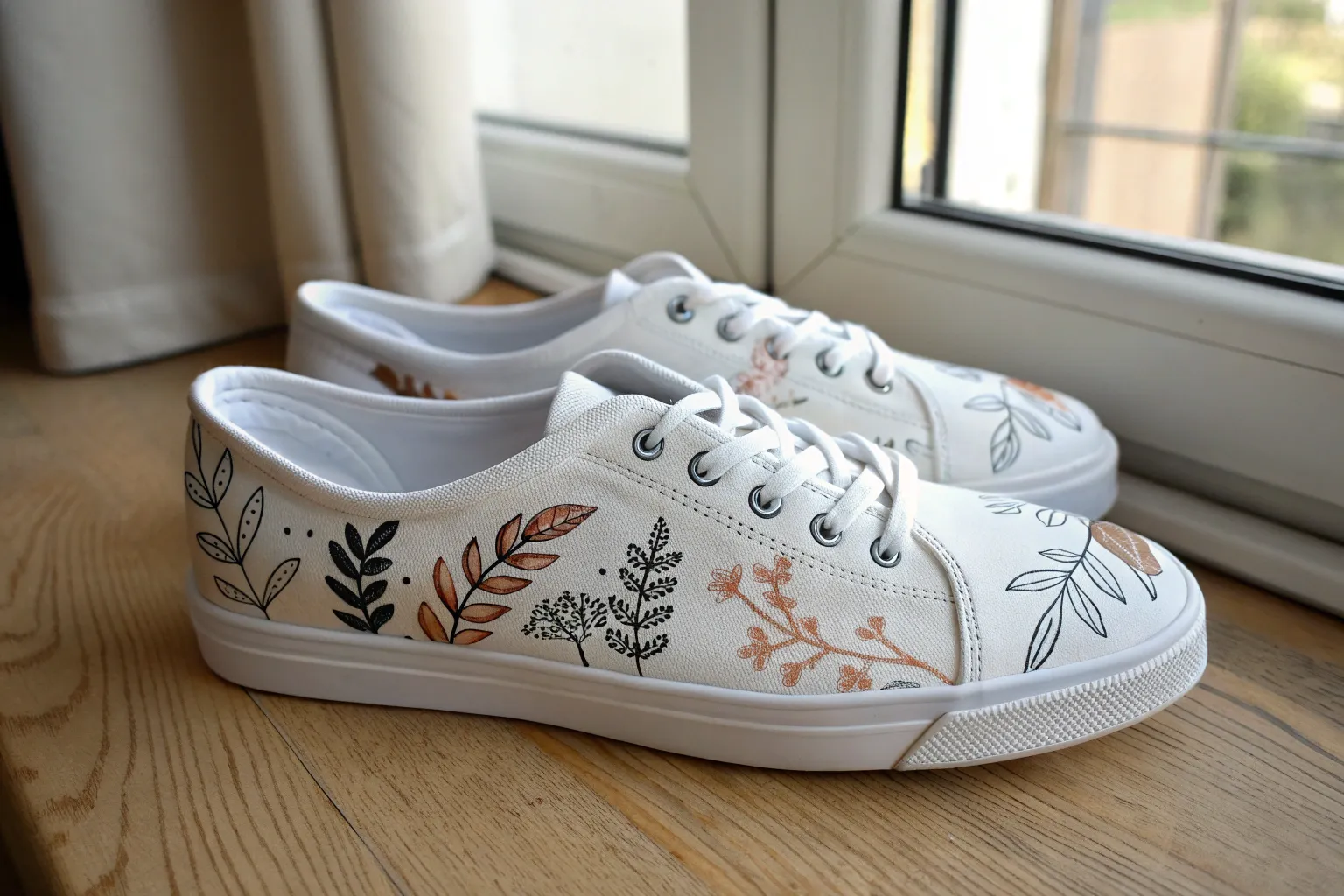 Mixed-media canvas sneaker with subtle stencils and bold hand-painted florals, Nordic boho contrast