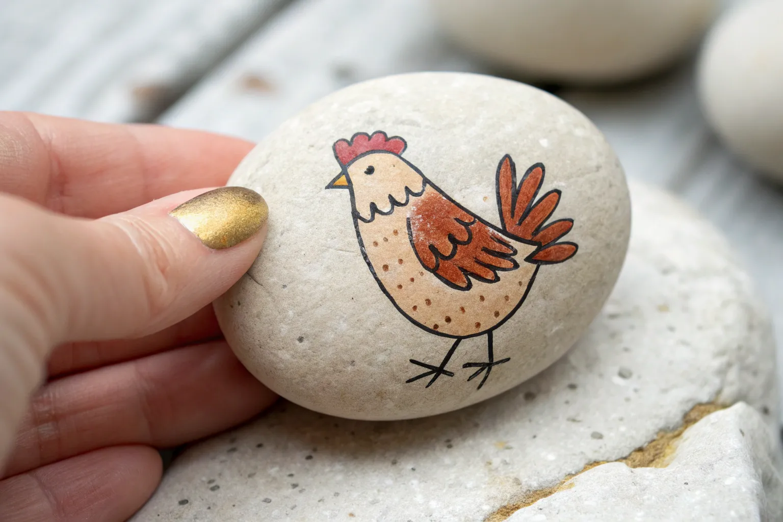 Paint rocks of different sizes to create a whole family, using slightly different comb shapes or beak colors for each hen.