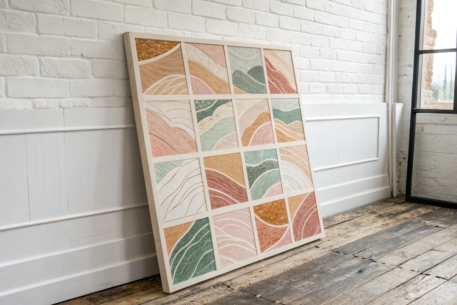 Collaborative tile grid mural in soft boho neutrals, each square uniquely hand-painted.