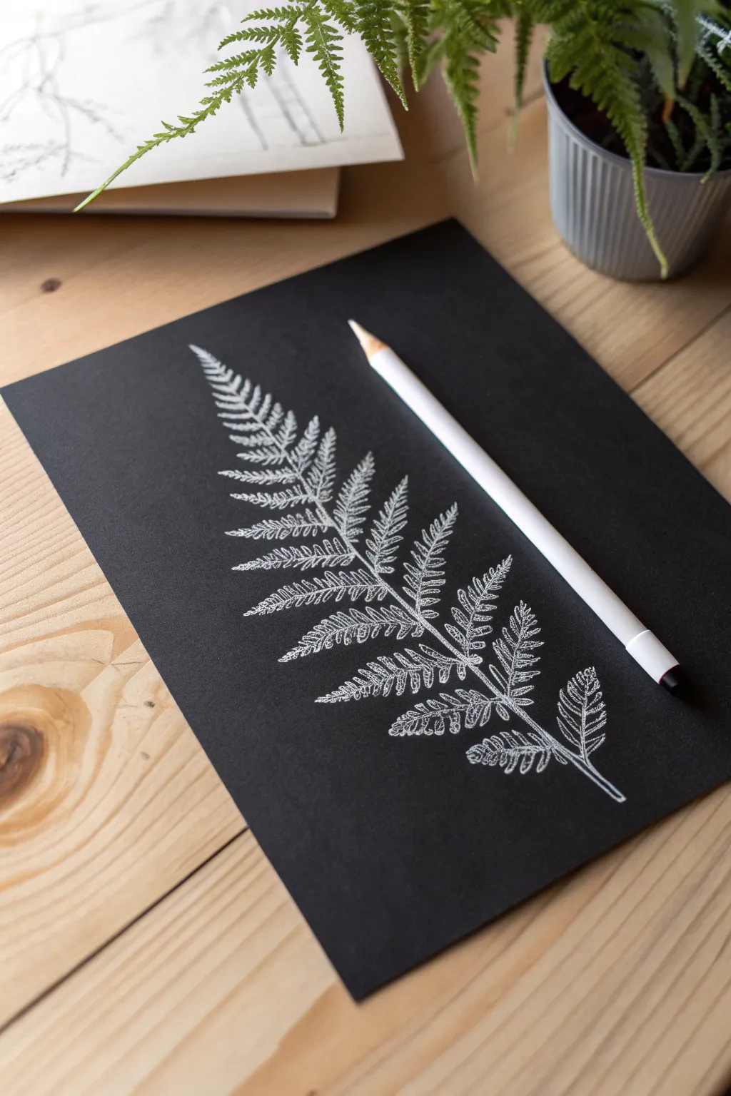 Capture the delicate beauty of a fern frond using the high-contrast drama of white colored pencil on black paper. This monochromatic study emphasizes texture and negative space, creating a botanical illustration that quite literally pops off the page.