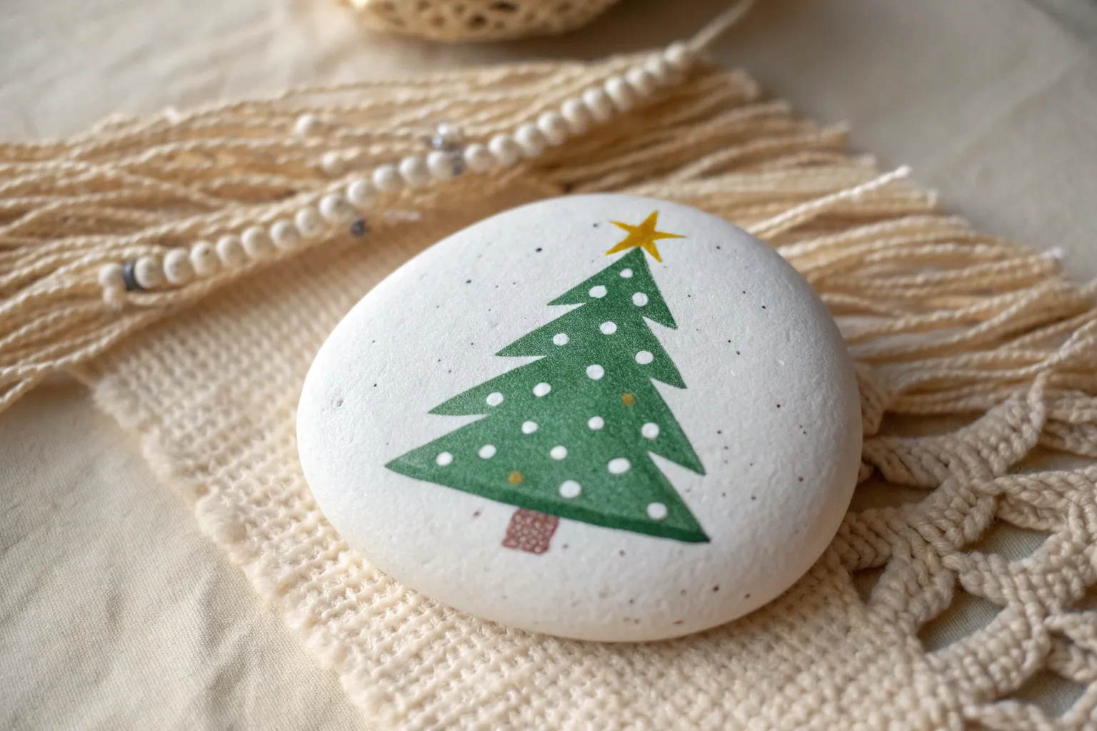 This elegant little project transforms a smooth river rock into a festive keepsake featuring a classic Christmas wreath. The design combines delicate leaf details with playful texture dots for a look that feels both traditional and modern.