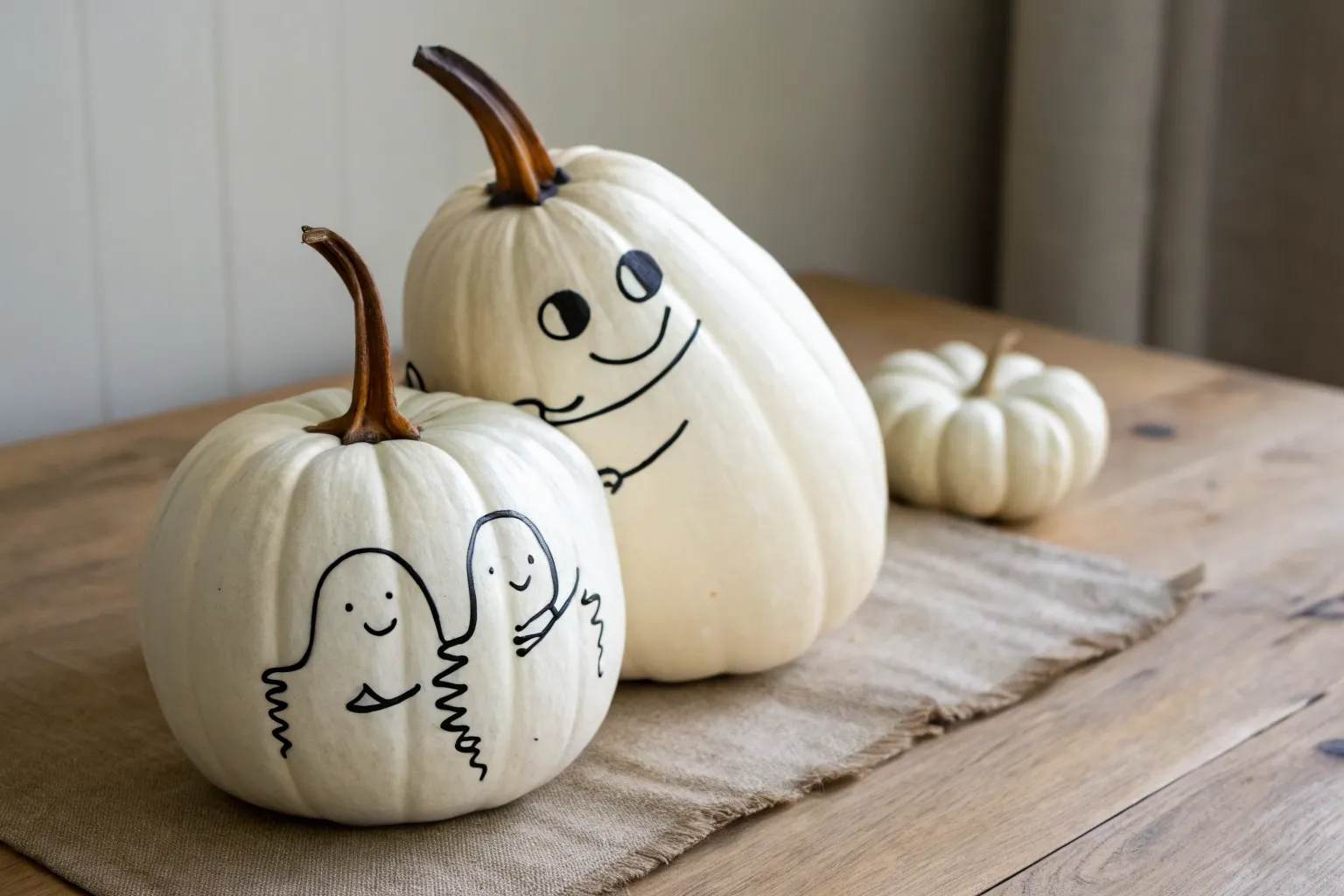 Bring character to your autumn display with this adorable pair of pumpkin personalities featuring delicate sleeping faces and charming mixed-media accessories. The soft white pumpkins serve as the perfect canvas for simple black line work and textured toppers, creating a whimsical “couple” look.