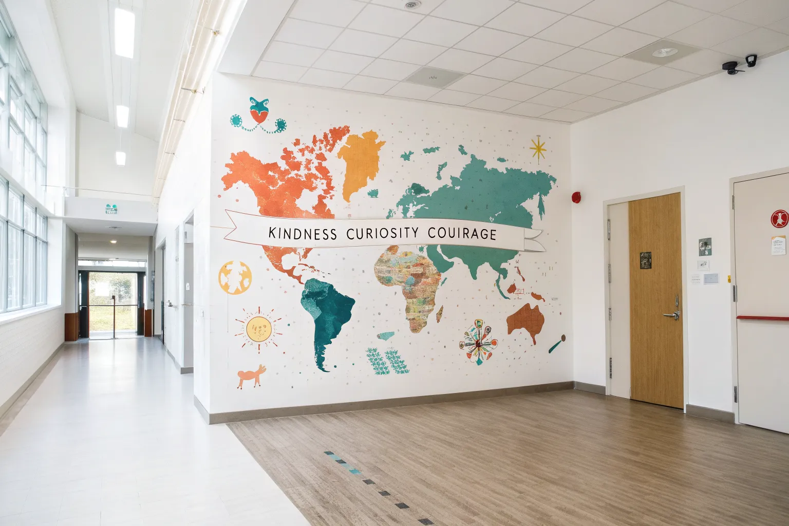 Transform a plain school entrance into an inviting landmark with this bold typographic mural. Featuring classic scholastic motifs like a pencil, basketball, and stars alongside a friendly greeting, this large-scale project sets a positive tone for every student walking through the doors.