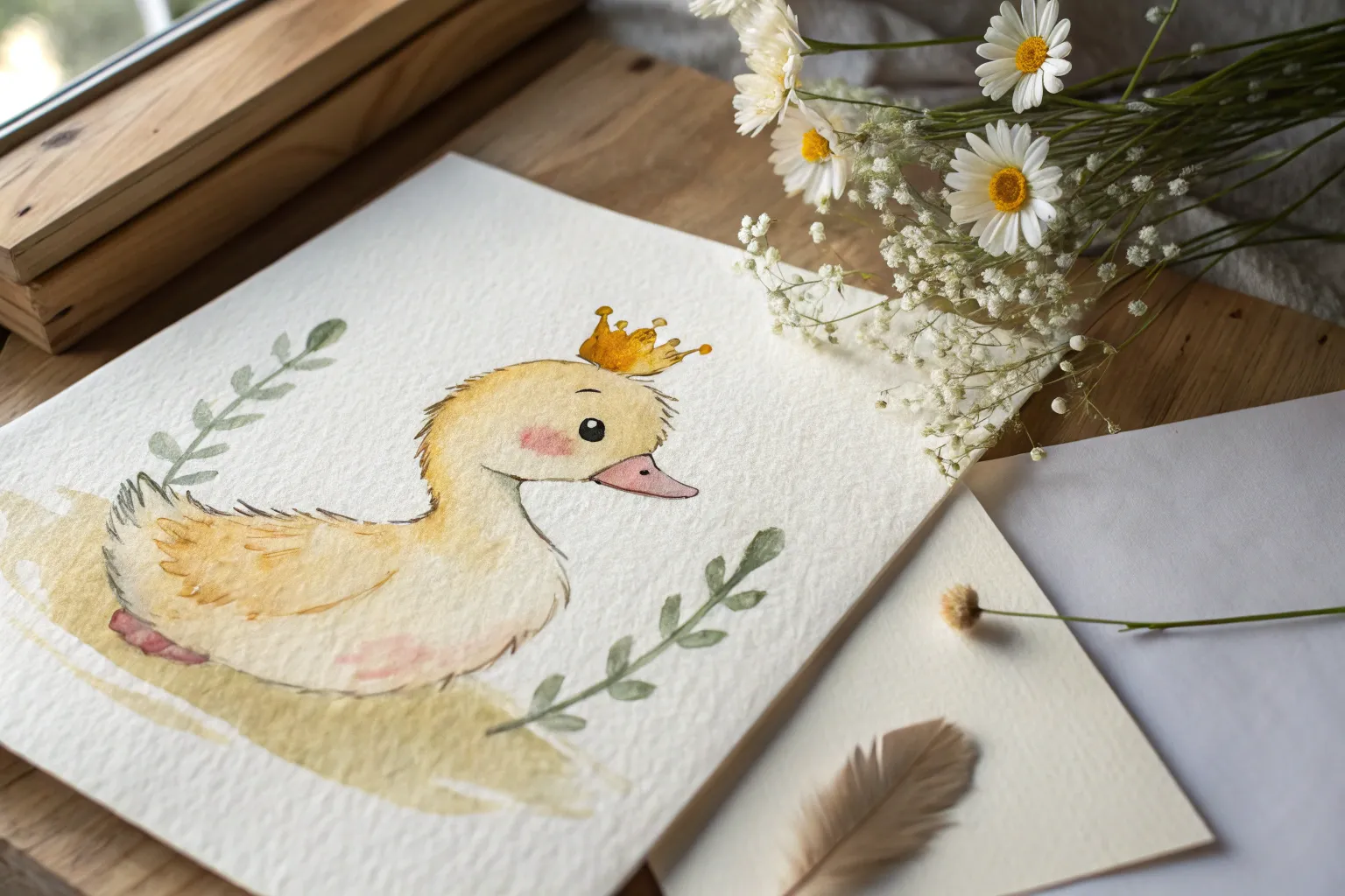 Once everything is bone dry, use white gouache or a gel pen to add sharp highlights. Place three dots on the duck’s body, a glint on the beak, and highlights on the top curve of each bubble. -