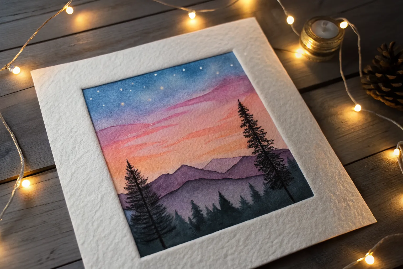 Once the sky is blended, scratch tiny dots into the upper purple section with a toothpick or add white gel pen dots to create early sparkling stars.