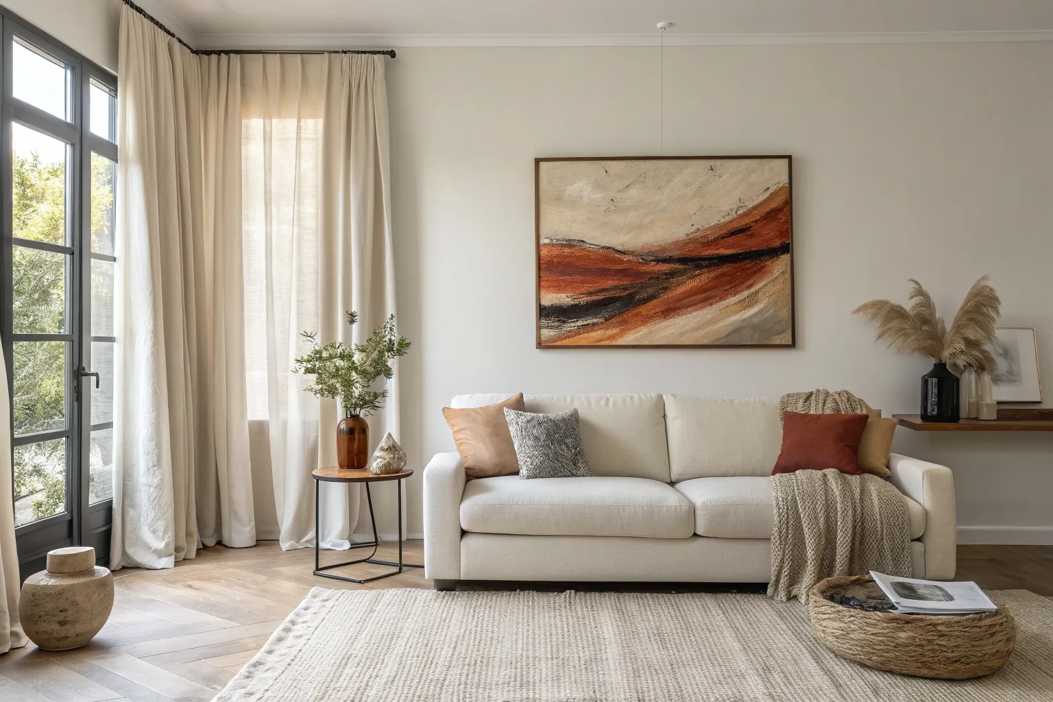 Oversized abstract canvas transforms a calm Scandinavian room with boho warmth and texture.