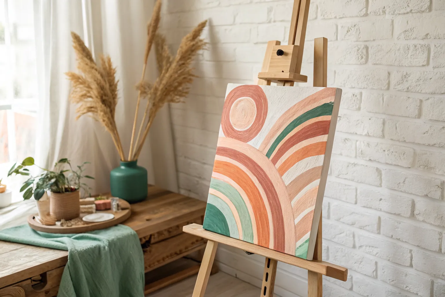 - Acrylic paints (Sage Green, Coral/Muted Pink, White)