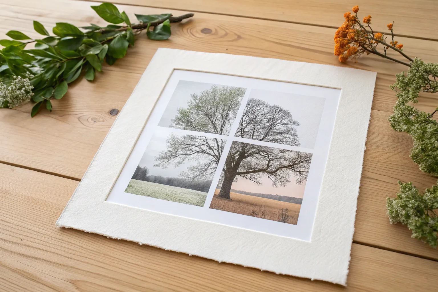 Four mini canvases become one year, season by season, with one simple tree tying it together.