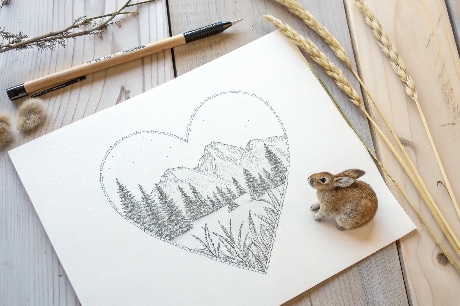 This romantic ink illustration features a gnarled tree trunk that divides to form a perfect negative-space heart in the center of its canopy. Using standard fine liners and texturing techniques, you will build up organic bark patterns and delicate roots.