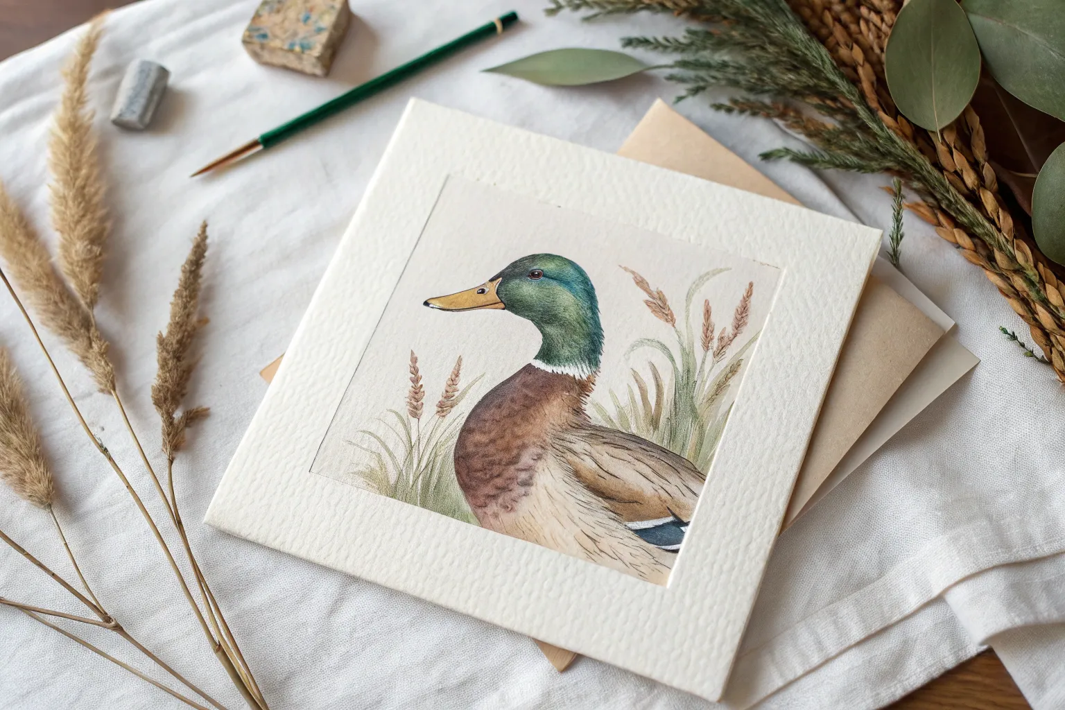 Draw thin stems rising behind the duck using a liner brush and pale green-brown. For the seed heads at the top, use a stippling motion with Yellow Ochre and Burnt Sienna to create a fuzzy texture.