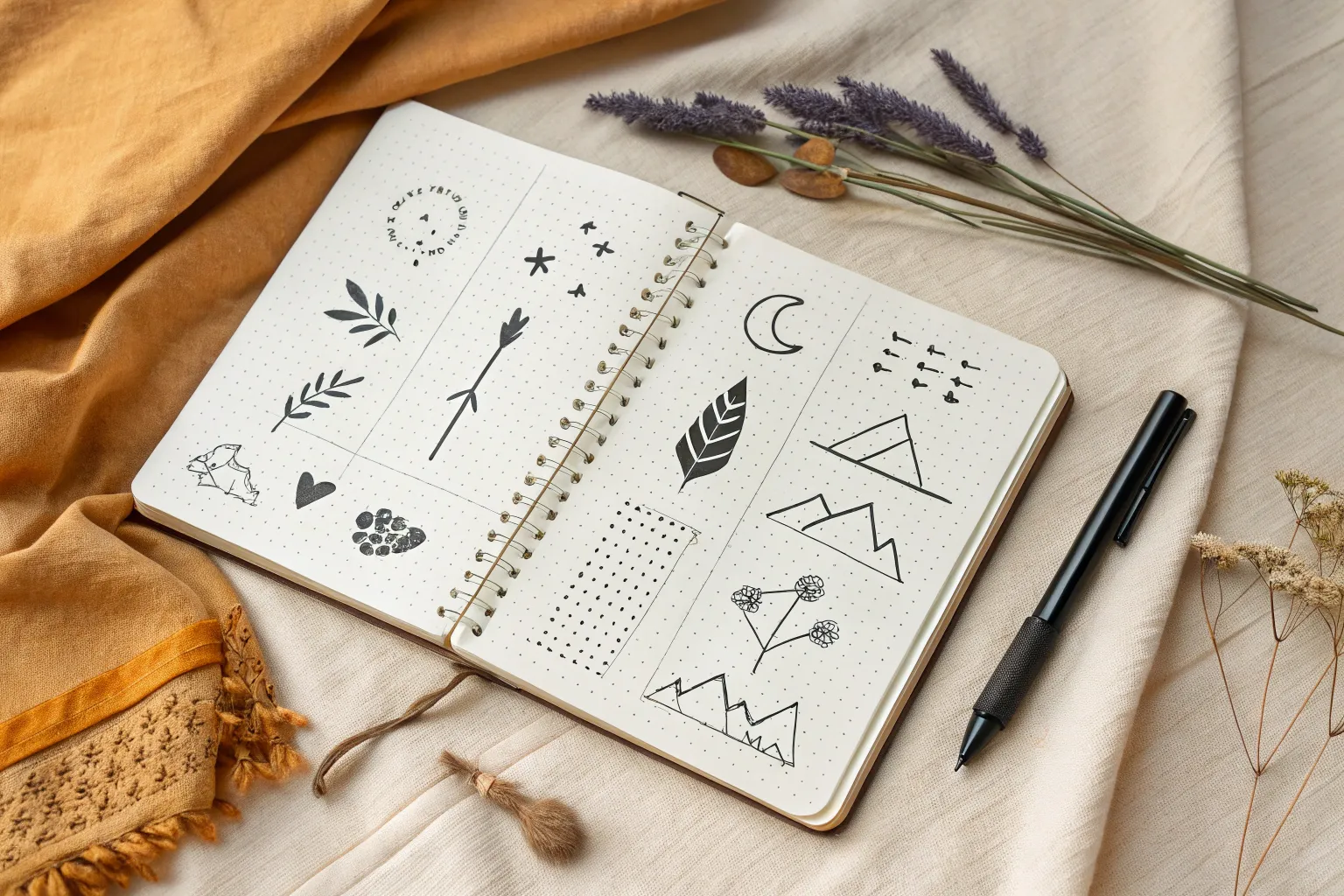 This adorable doodle features two retro-style robots sharing a moment of connection amidst a flurry of hearts. It’s a perfect beginner-friendly project for your bullet journal, using simple geometric shapes to build character.