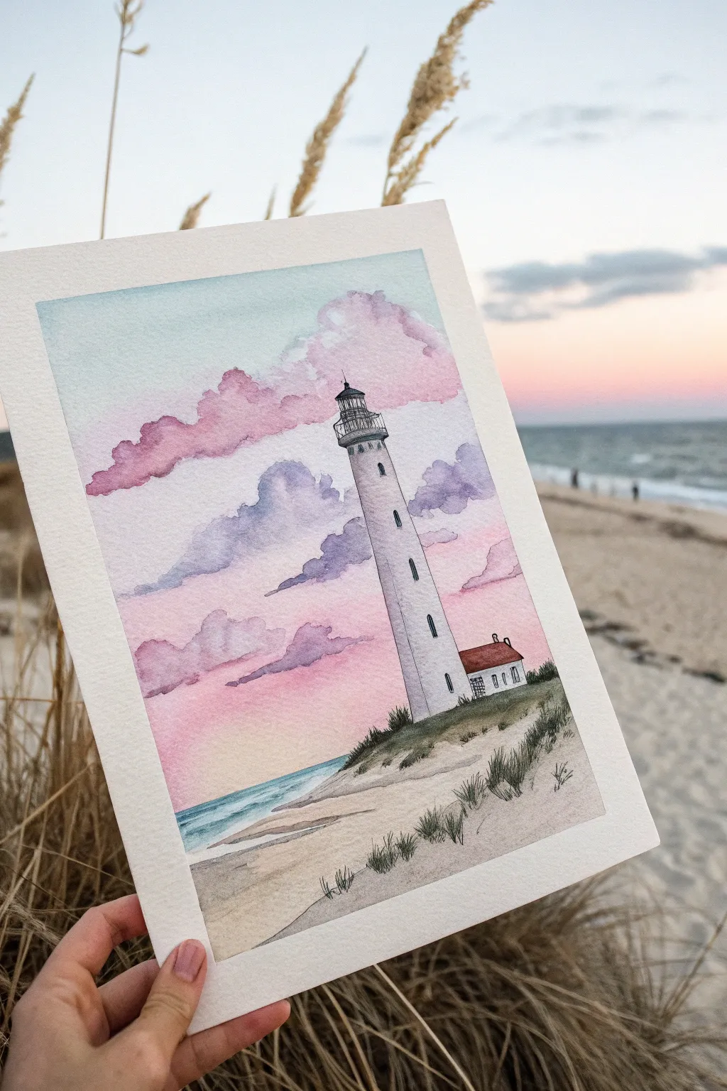 Capture the serene beauty of a classic seaside beacon with this detailed watercolor tutorial. The stark white lighthouse creates a stunning contrast against the moody, cloud-filled sky and deep blue ocean, making it a perfect subject for practicing values and crisp edges.