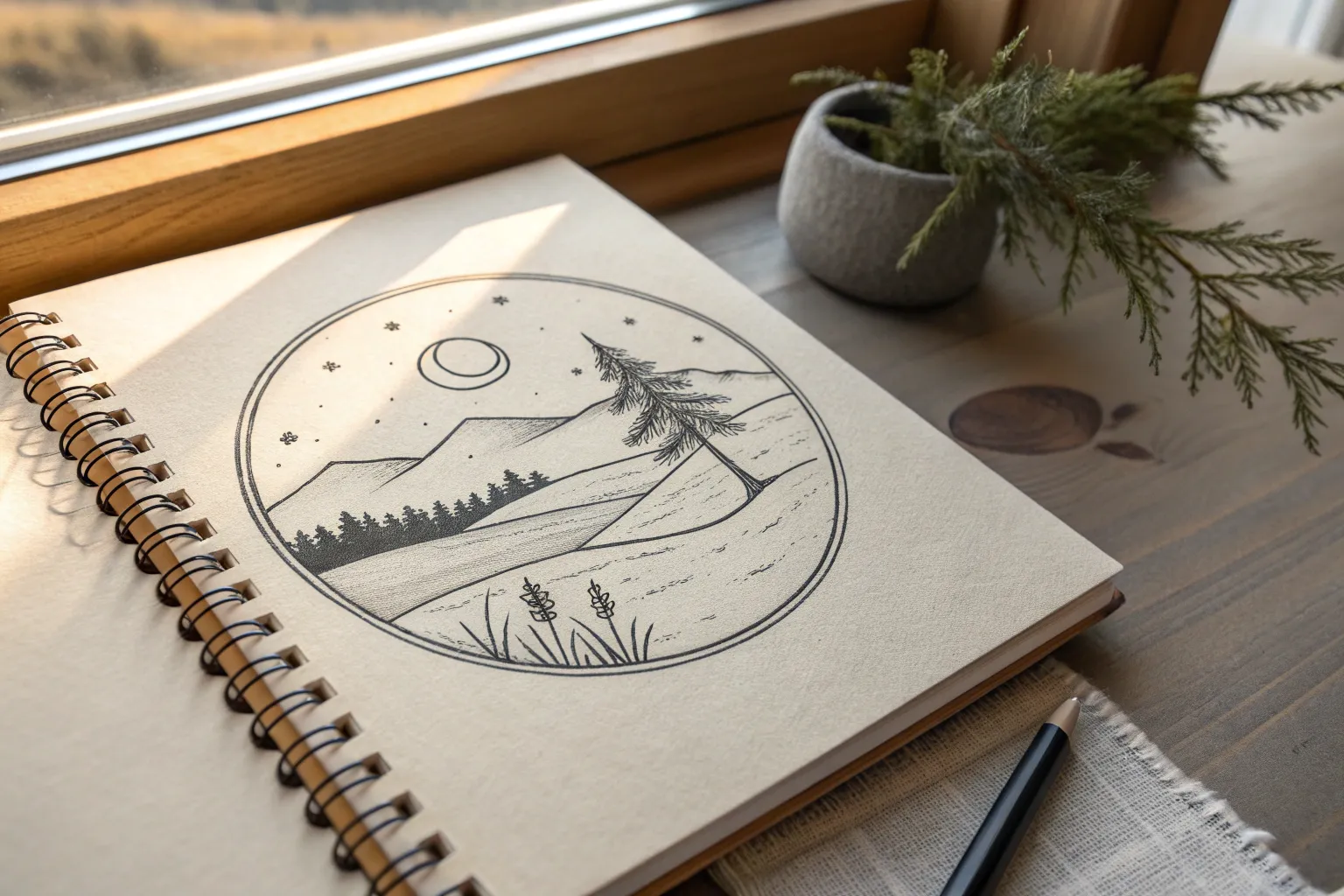 Capture the essence of the outdoors with this charming grid of miniature landscapes and botanical doodles. Using fine liners and metallic accents creates a delicate, exploratory feel perfect for filling a journal page without the pressure of a full composition.