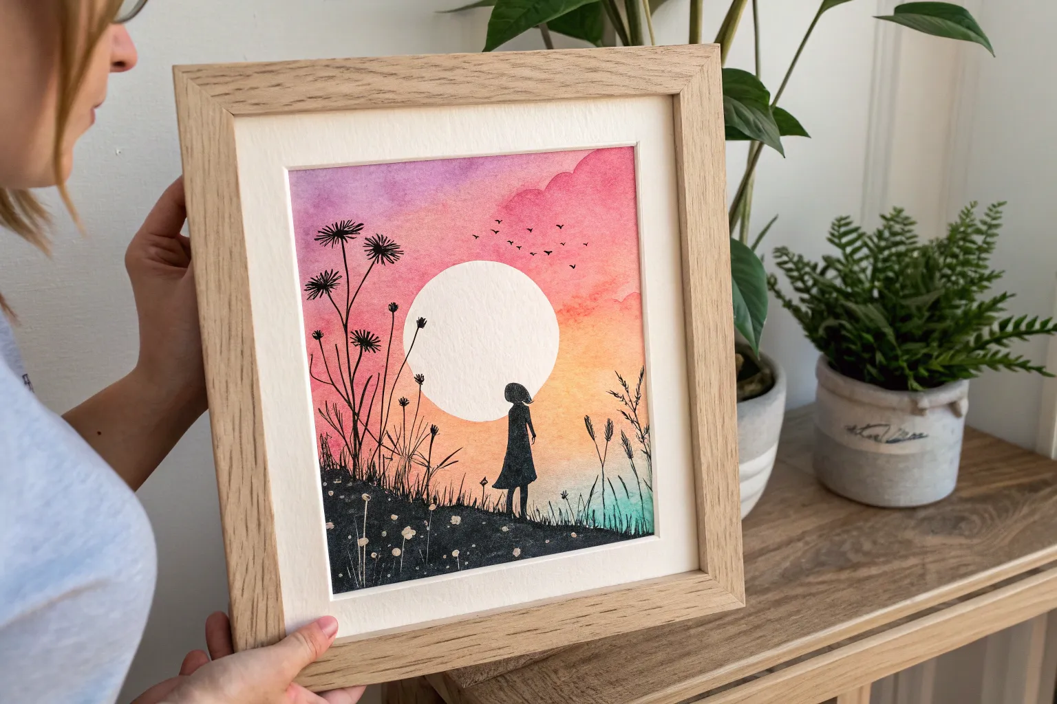 This project captures the serene beauty of dusk with a vibrant watercolor gradient background contrasted against crisp, black tree silhouettes. Using a stencil technique ensures your shadows are sharp and professional-looking without needing advanced drawing skills.