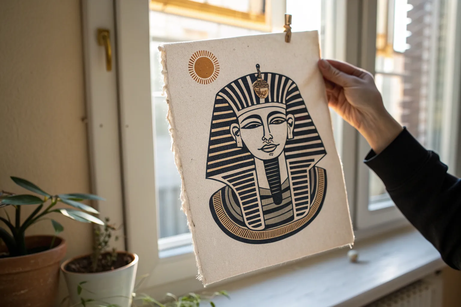 To mimic an aged papyrus look, you can very lightly sponge a dilute wash of tea or watered-down brown paint over the unpainted background areas, avoiding your fresh illustrations.
