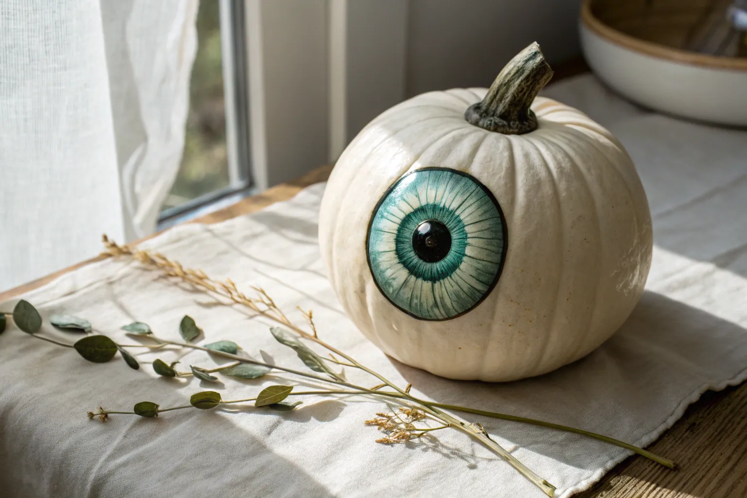 Transform a simple white pumpkin into a chic, mystical centerpiece with this geometric eye design. Featuring bold black lines and shimmering gold accents, this no-carve project adds a modern bohemian touch to your autumn decor.