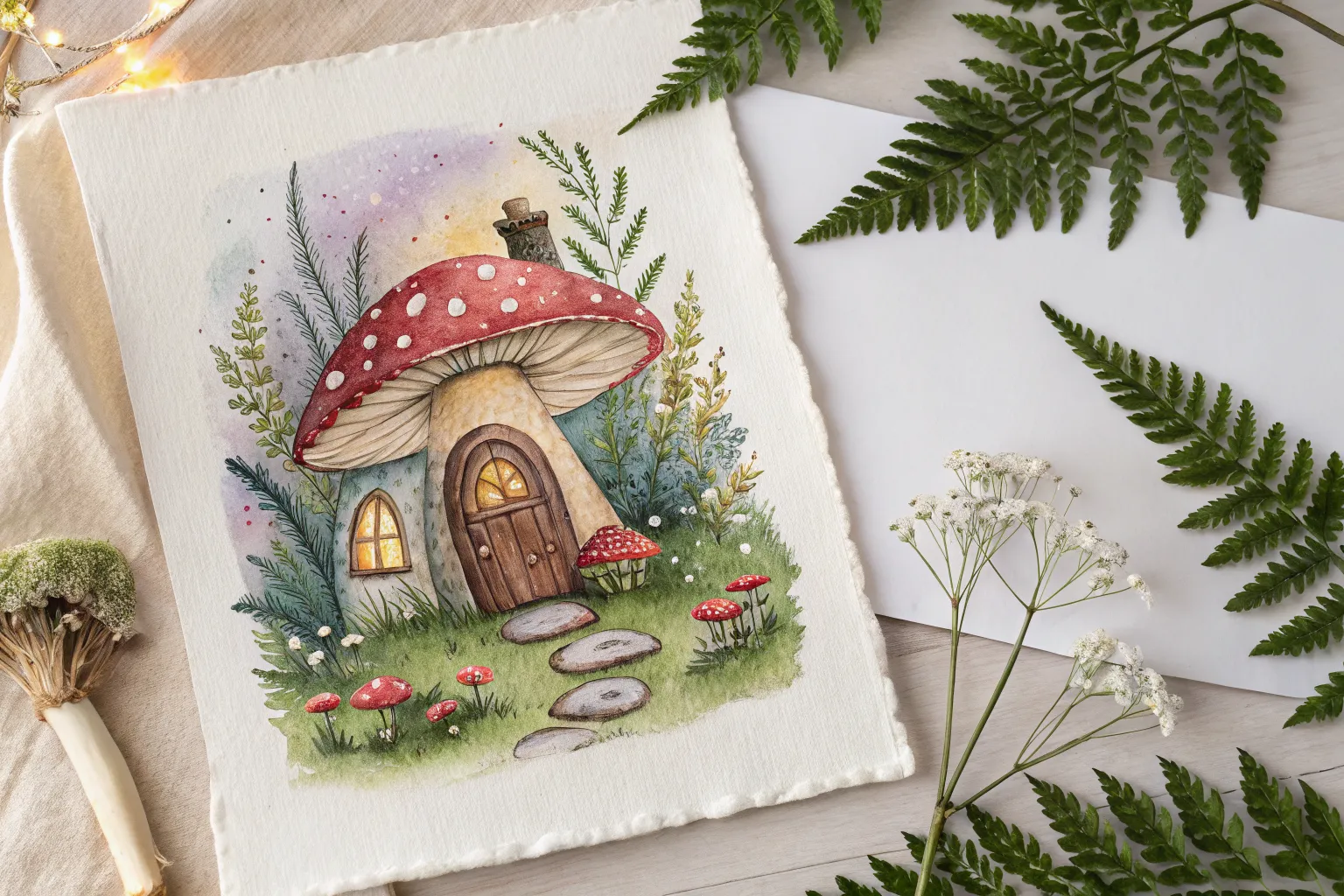 Use white gouache or a gel pen to add tiny highlights to the window pane, the door handle, and the very tops of the mushroom spots to make them pop.