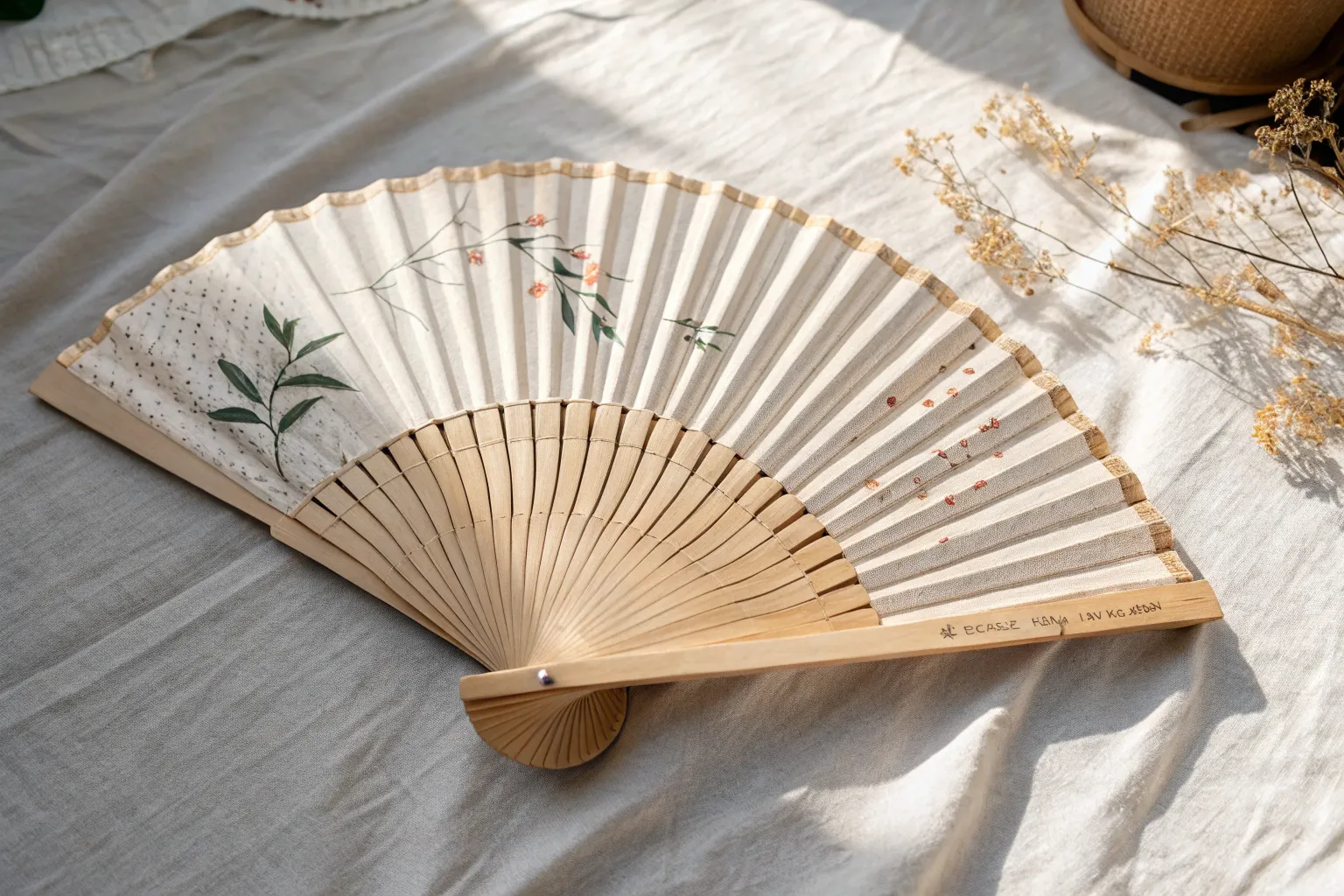 - Blank wooden folding fan with fabric or heavy paper leaf