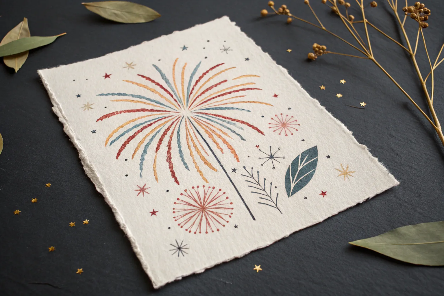 Minimalist fireworks doodles with bold color pops and airy negative space on crisp paper