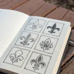Sketch four miniature fleur de lis symbols in the corners surrounding the main design. Keep these looser and slightly less detailed than the centerpiece.