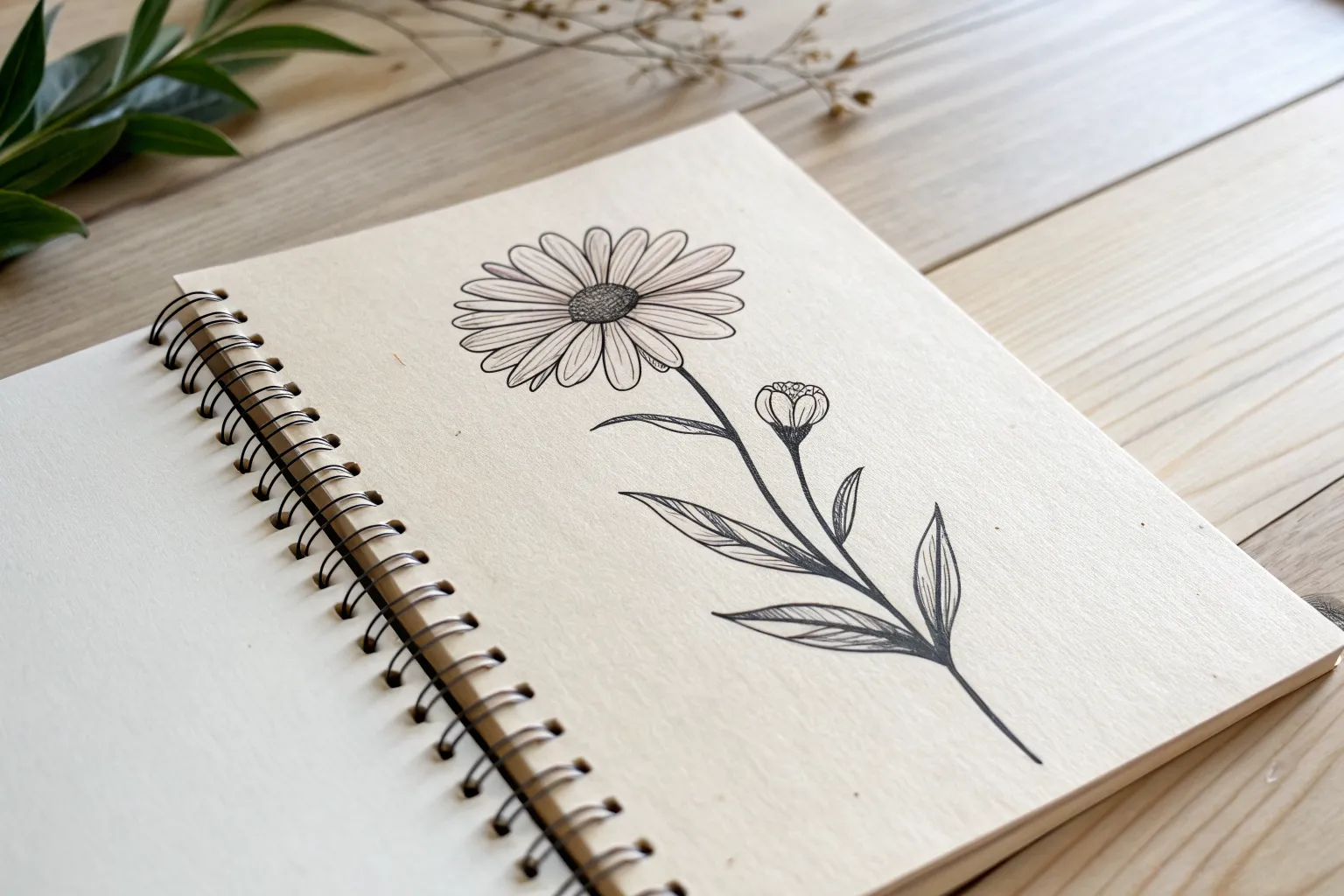 Visualize the page layout. You’ll want the tall bud branch in the center-top, the rose on the bottom-left, and the daisy on the bottom-right. Lightly mark the stem lines for each to establish flow and spacing.