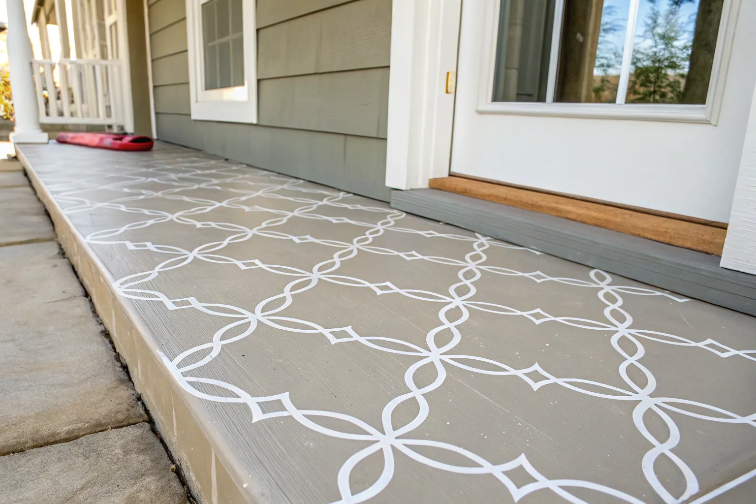 Transform a plain concrete porch into a welcoming entryway with this clever painted rug illusion. Using durable porch paint and careful taping, you can create a sophisticated border design that mimics a high-end sisal or woven rug without the worry of mold or tripping hazards.