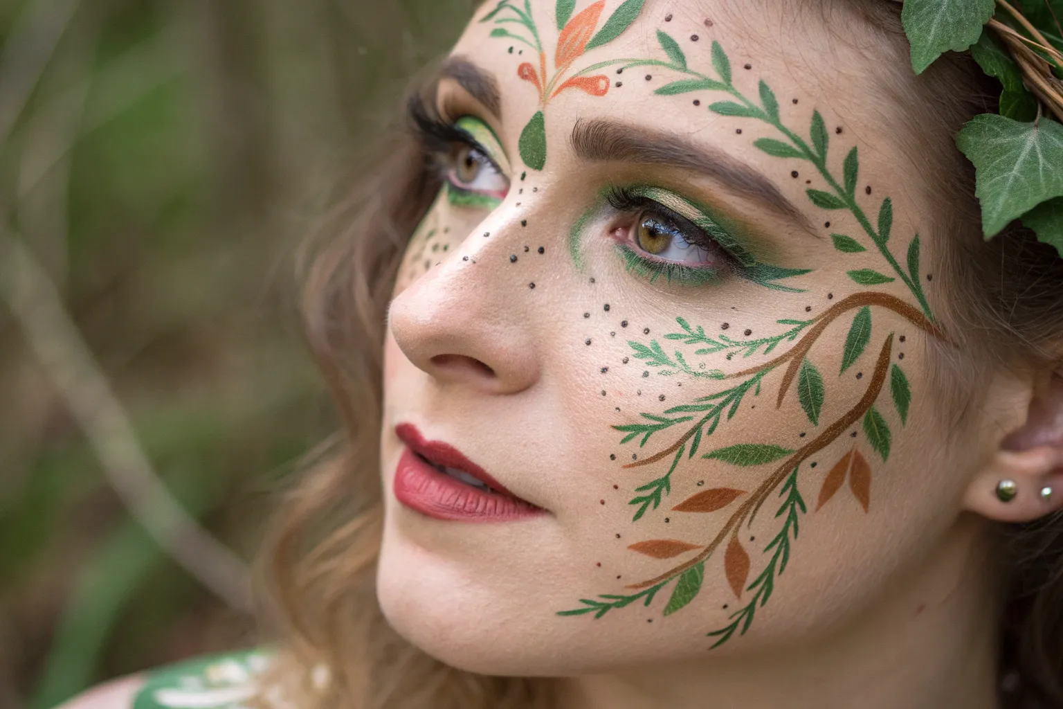 Wash a sheer layer of metallic bronze or champagne eyeshadow over the eyelids. Keep the actual eye makeup minimal to let the painted elements take center stage. -