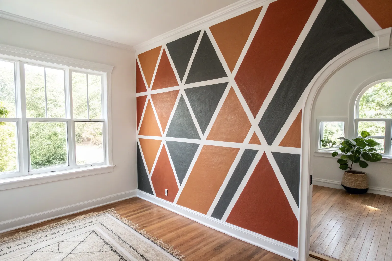 Transform a plain wall into a stunning focal point with this large-scale geometric triangle design. Featuring a warm palette of dusty pinks, terracotta, and sage greens separated by crisp white lines, this project adds immediate architectural interest and a modern touch to any space.