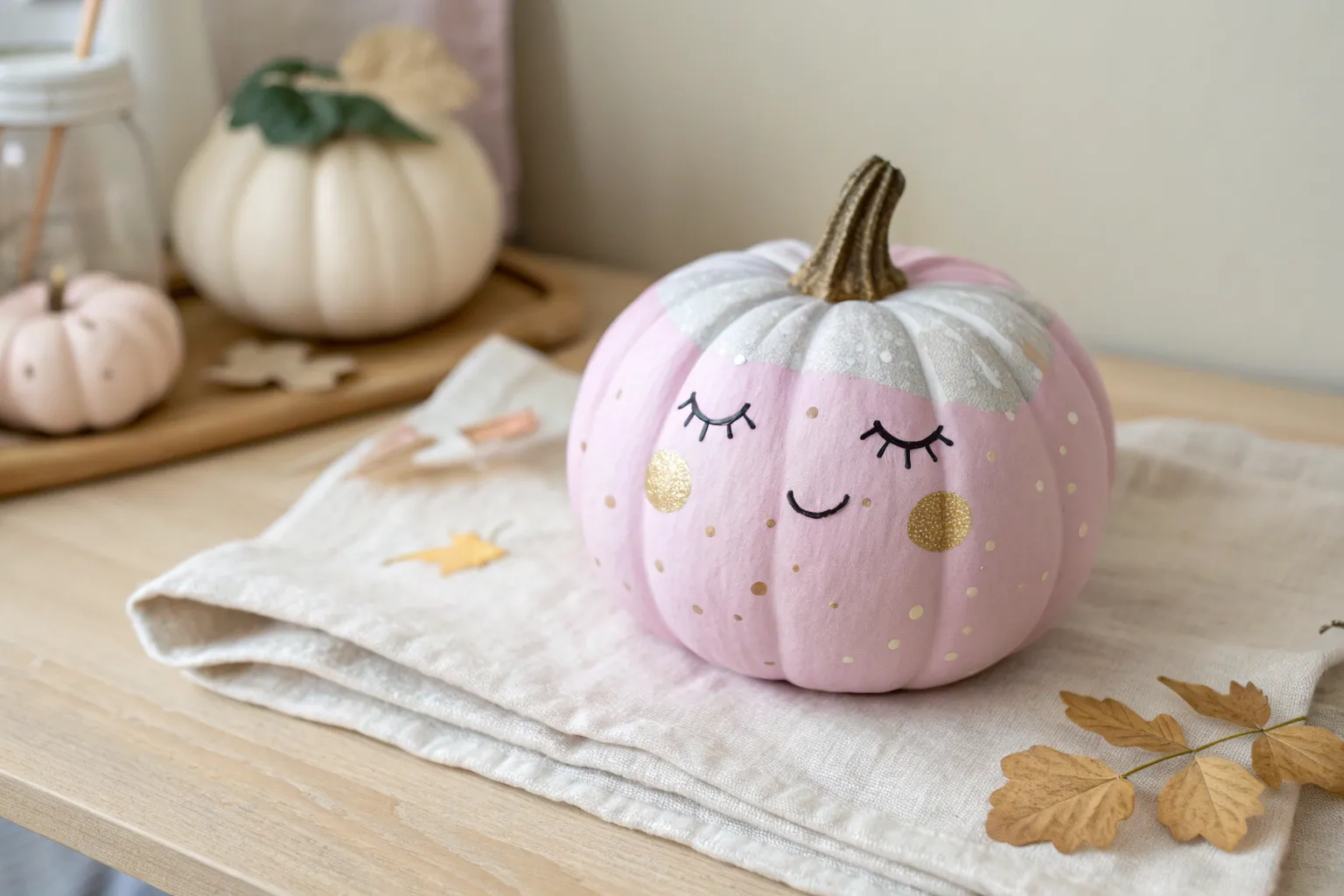 Transform an ordinary pumpkin into a charming character with soft pink paint and sparkling accents. This project combines simple painting techniques with mixed-media touches like rhinestones and glitter to create a sweet, sleeping face that adds a touch of elegance to your fall decor.