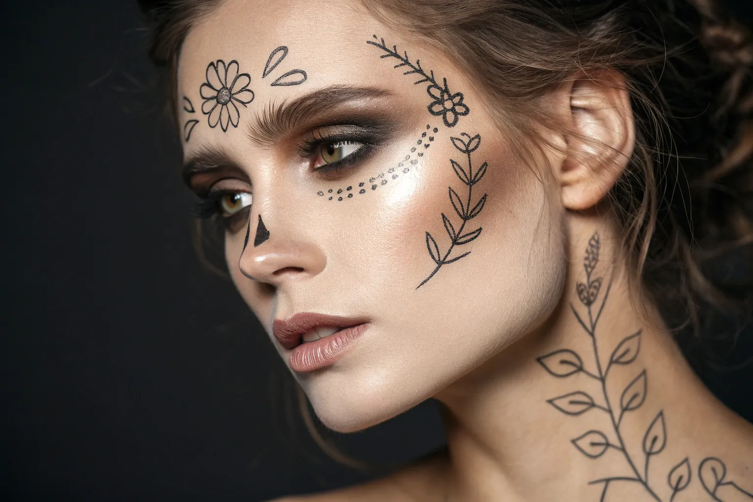 This hauntingly beautiful look combines traditional Dia de los Muertos elements with an earthy, bohemian twist suited for a sophisticated costume. By blending stark linework with soft, dried floral accessories, you achieve a style that is both spooky and ethereal.
