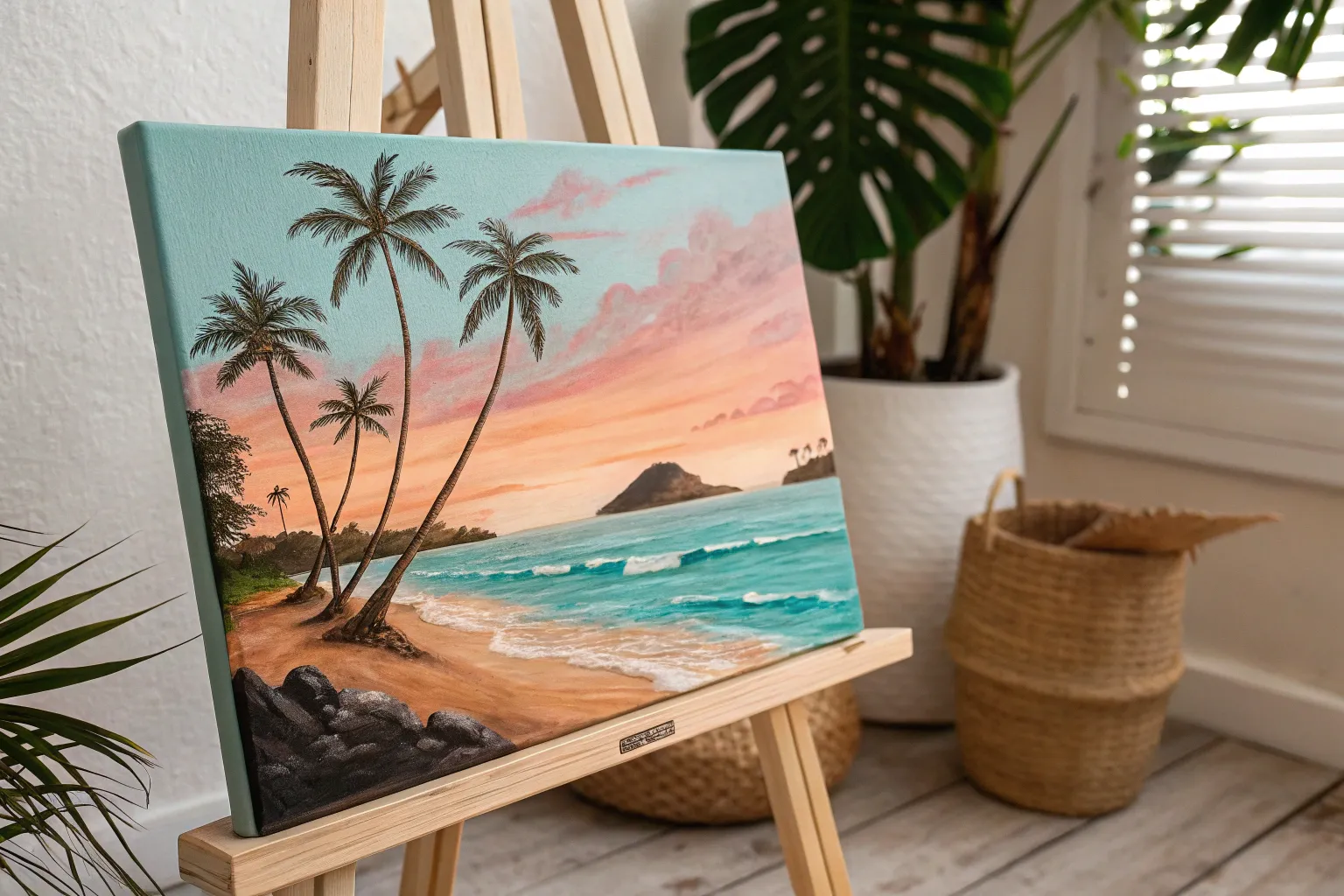 Minimal palm silhouette painting idea with a dreamy Hawaii sunset gradient and calm ocean line
