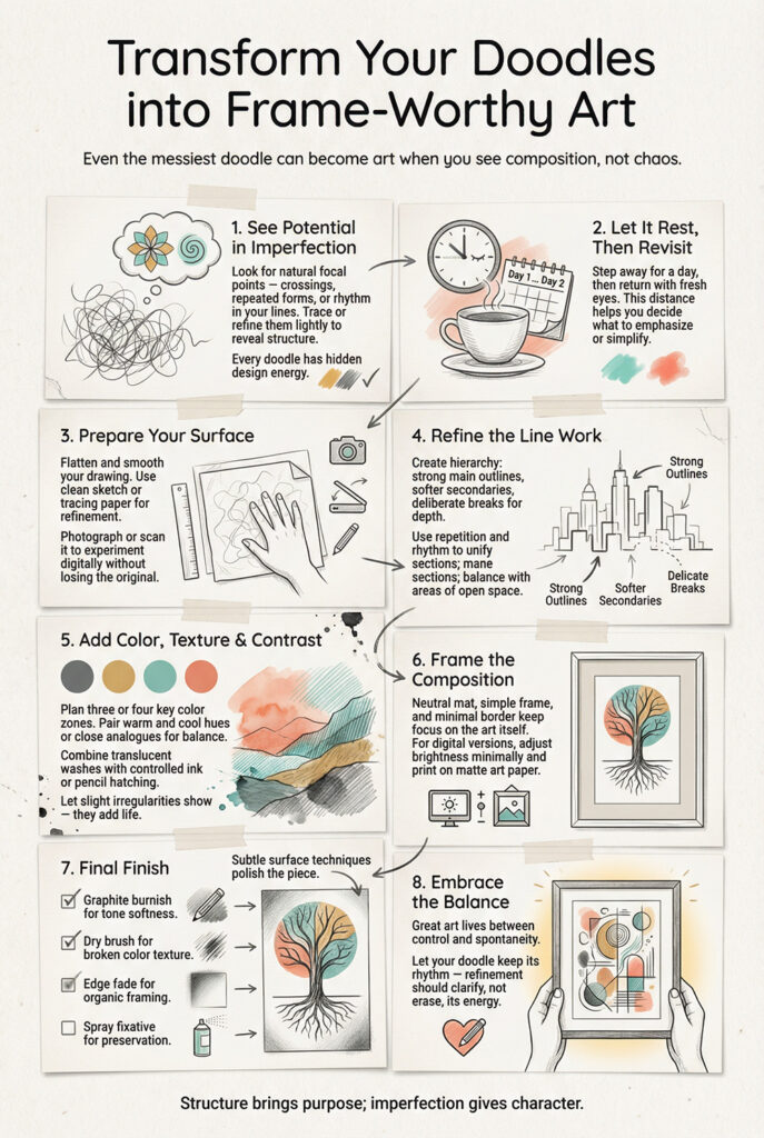 Transforming messy doodles into frame-worthy art isn’t about perfection. It’s about recognizing value in spontaneity and refining that energy through deliberate technique. When you allow randomness and structure to coexist, the result carries both discipline and personality — qualities shared by every memorable piece of art.