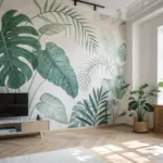 Draw medium-sized Monstera leaves and fan palms in the negative spaces. Don’t worry about overlapping yet; just map out where the major forms will sit.
