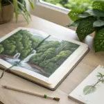 A hidden jungle waterfall scene to paint: calm pool, lush ferns, and soft misty light.